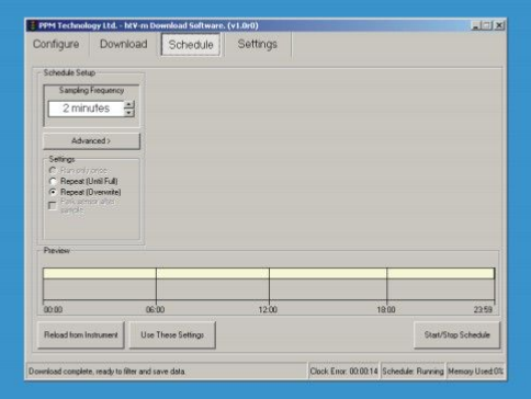 日程表功能的作用是使用HTV-M儀器內(nèi)部的時(shí)鐘計(jì)時(shí),按照規(guī)定的時(shí)間間隔進(jìn)行自動(dòng)采樣。 甚至可以在一周內(nèi)某個(gè)特定的時(shí)間進(jìn)行采樣,直到內(nèi)存被記錄滿。