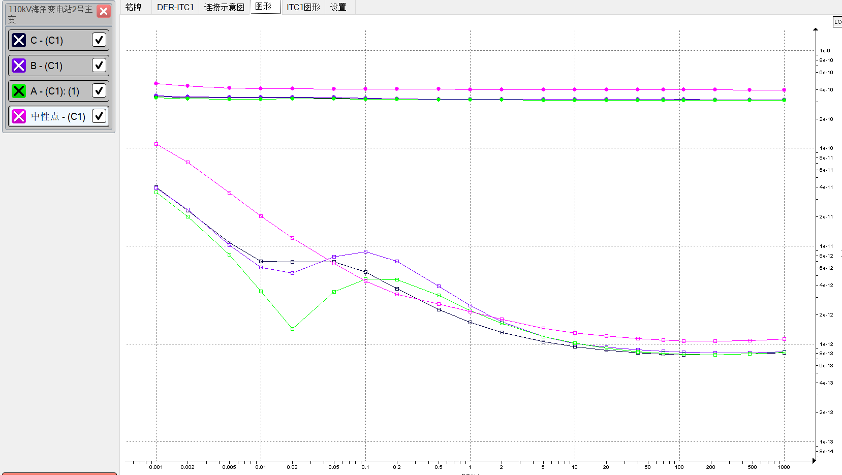2023年9月3日,南方電網(wǎng)某變電站1號(hào)主變,套管FDS試驗(yàn)。測(cè)試高壓側(cè)套管A相、B相、C相及中性點(diǎn)四根套管,ITC1測(cè)試結(jié)果顯示綠色,四根套管的絕緣性能均為新,從介損來(lái)看并無(wú)異常。