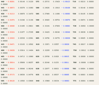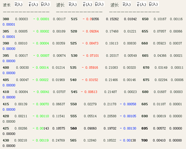 通過(guò)這一段分析可以看出,從546.1nm到690nm這一段,b的數(shù)量是由0開始增加,之后又減少,到了690nm處的時(shí)候減少到0。顯然b在這區(qū)間內(nèi)肯定要有一個(gè)*大值?,F(xiàn)在,我們來(lái)看一下“光譜三刺激值”表中的546.1nm到690nm這一段,其中起輔助作用的光的“藍(lán)原色”的數(shù)量的變化(即,藍(lán)色三刺激值的變化),不*是這樣的一種情形嗎?它有一個(gè)*大值*發(fā)生在545nm處,數(shù)值的大小是0.00138(在表中我們對(duì)這個(gè)*大值中的138標(biāo)了黑色,目的為了便于重新查找它。至于這個(gè)“刺激值”的負(fù)號(hào)來(lái)源,也*無(wú)需再作解釋了)。