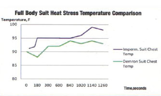 實驗條件:工作人員身穿不同防護服,以3.5英里/小時的速度在跑步機上慢跑3分鐘后測量全身防護服的溫度,再隨時間推移不斷測量防護服內(nèi)的溫度變化。藍(lán)色曲線代表通用防護服,綠色曲線代表使用Demron材料制成的防護服。