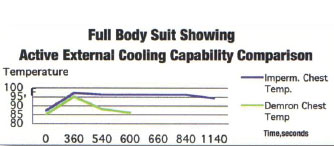 實驗條件:工作人員身穿不同防護服,以3.5英里/小時的速度在跑步機上慢跑10分鐘后測量全身防護服的溫度。藍(lán)色曲線代表通用防護服,綠色曲線代表使用Demron材料制成的防護服。