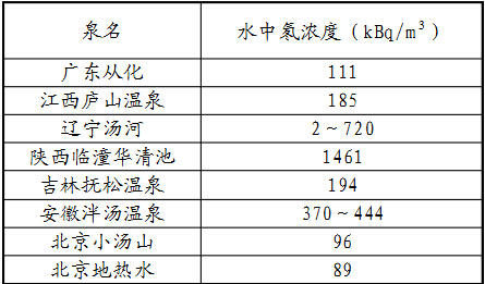 四、生活用水中的氡易溶于水,其半衰期很短,可以從水中迅速衰變逸出。因此地表水中氡含量較低,基本上不存在因水而來的氡問題。城市中在對(duì)水進(jìn)行處理時(shí),會(huì)將水暴露于空氣中,使氡可以逸出,因此也不會(huì)帶來大的氡污染。然而在以地下水作為直接用水來源的地區(qū)(以農(nóng)村為主),則可能因?yàn)楣┧到y(tǒng)封閉導(dǎo)致氡不能及時(shí)逸出,而通過淋浴或其他家庭活動(dòng)釋放出來,增加室內(nèi)氡濃度,甚至對(duì)室內(nèi)氡污染起到支配作用。值得一提的是,溫泉和地?zé)崴紒碜缘叵律畈浚焙枯^高。(表3) 表3溫泉和地?zé)崴械碾睗舛取?/span>