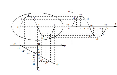如果將被測(cè)信號(hào)電壓加到垂直偏轉(zhuǎn)板上,鋸齒波掃描電壓加到水平偏轉(zhuǎn)板上,而且被測(cè)信號(hào)電壓的頻率等于鋸齒波掃描電壓的頻率,則熒光屏上將顯示出一個(gè)周期的被測(cè)信號(hào)電壓隨時(shí)間變化的波形曲線(如下圖所示)。由下圖所示可見,在時(shí)間t=0的瞬間,信號(hào)電壓為Vo(零值),鋸齒波電壓為V0′(負(fù)值),熒光屏上光點(diǎn)在坐標(biāo)原點(diǎn)左面,位移的距離正比于電壓V0′;在時(shí)間t=1的瞬間,交流電壓為V1(正值),鋸齒波電壓為V1′(負(fù)值),熒光屏上光點(diǎn)在坐標(biāo)的第Ⅱ象限中。同理,在時(shí)間t=2,t=3,…,t=8的瞬間,熒光屏上光點(diǎn)分別位于2,3,…,8點(diǎn)。在t=8瞬間,鋸齒波電壓由*大正值V8′跳變到*大負(fù)V0′,因而熒光屏上的光點(diǎn)也從8點(diǎn)極其迅速地向左移到起始位置0點(diǎn)。以后,在被測(cè)周期信號(hào)的第二個(gè)周期、第三個(gè)周期……都重復(fù)*個(gè)周期的情形,光點(diǎn)在熒光屏上描出的軌跡也都重疊在*次描出的軌跡上。所以,熒光屏上顯示出來的被測(cè)信號(hào)電壓是隨時(shí)間變化的穩(wěn)定波形曲線。